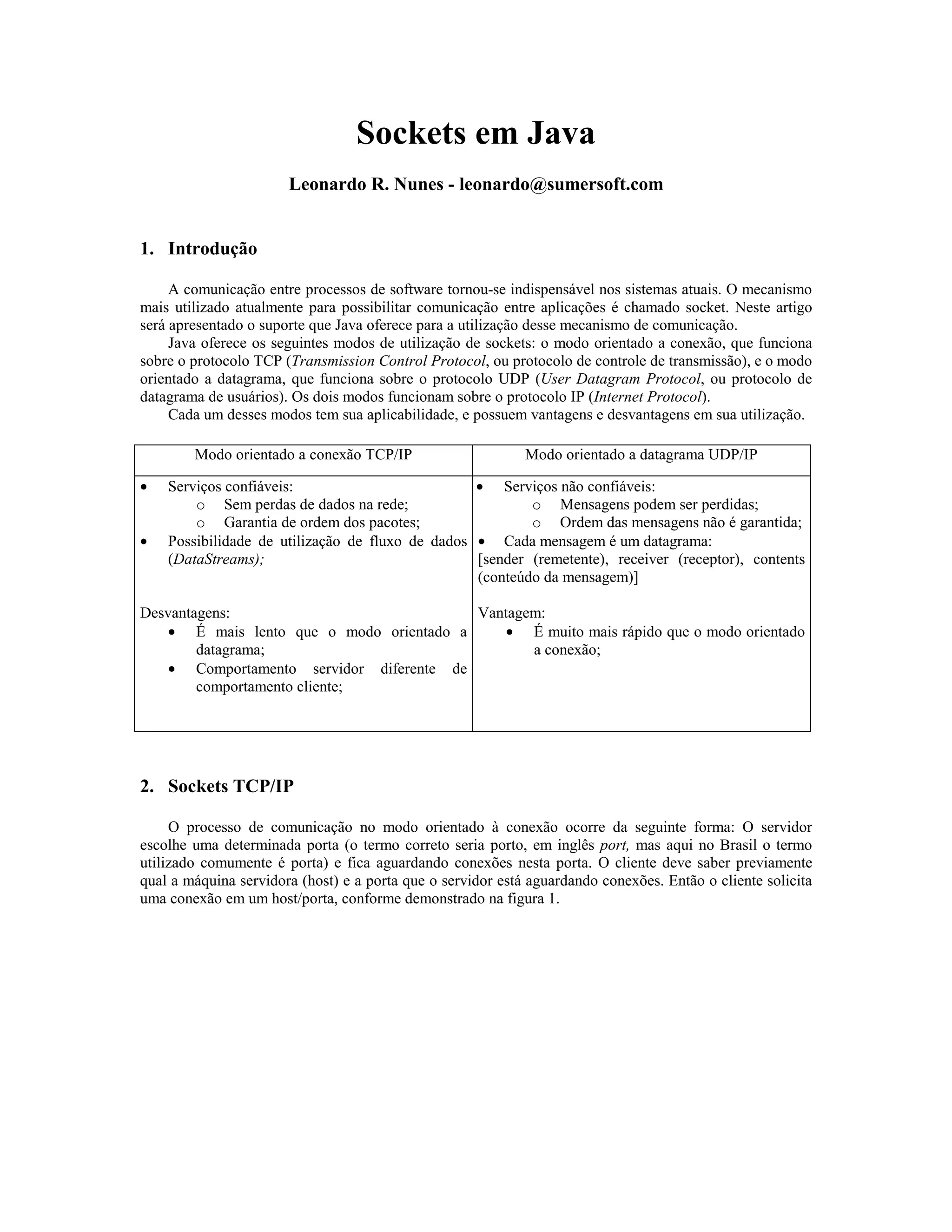 O documento discute o uso de sockets em Java para comunicação entre processos, descrevendo os modos orientados a conexão TCP e datagrama UDP. O TCP fornece comunicação confiável mas mais lenta, enquanto o UDP é mais rápido porém menos confiável. O documento também apresenta exemplos de código para criação de sockets cliente e servidor nos modos TCP e UDP.