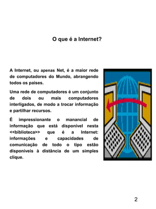 1. O documento descreve os principais conceitos relacionados à Internet, incluindo sua história, hardware e software necessários para acessá-la, serviços disponíveis como e-mail, World Wide Web, transferência de arquivos e grupos de discussão.