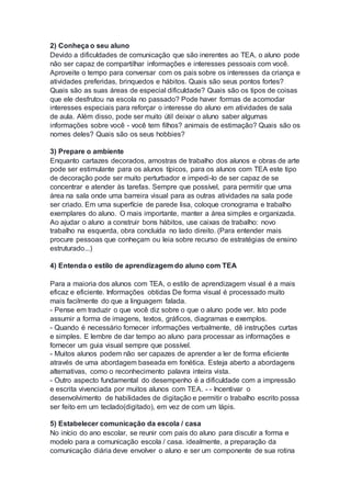 O documento fornece 10 estratégias para professores ensinarem alunos com Transtornos do Espectro do Autismo (TEA), incluindo aprender sobre TEA, conhecer as necessidades individuais do aluno, preparar o ambiente de aprendizagem, usar métodos visuais de ensino, e estabelecer comunicação entre a escola e a casa.