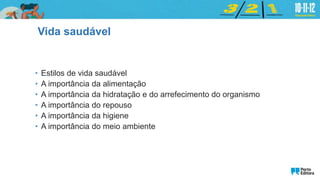 O documento discute os pilares de um estilo de vida saudável, incluindo a importância da alimentação balanceada, da hidratação, do repouso, da higiene e do meio ambiente. Ele explica que esses fatores podem ter um impacto positivo ou negativo na saúde a curto e longo prazo.