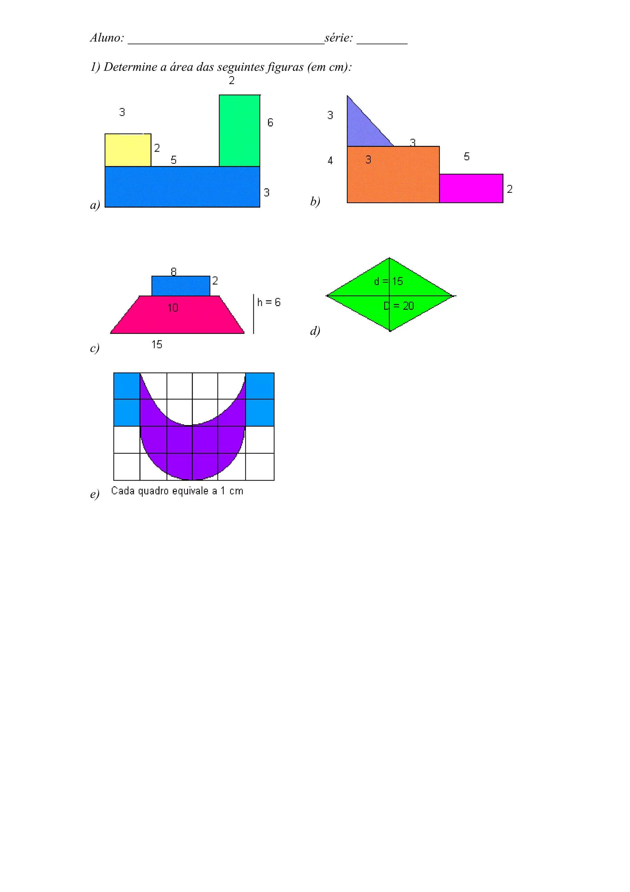 Este documento contém as respostas de um aluno para exercícios de geometria envolvendo área e perímetro de figuras planas. O aluno calcula áreas de retângulos, triângulos e trapézios, bem como perímetros de triângulos e quadrados. Ele também determina áreas e perímetros de dois retângulos dados suas medidas.