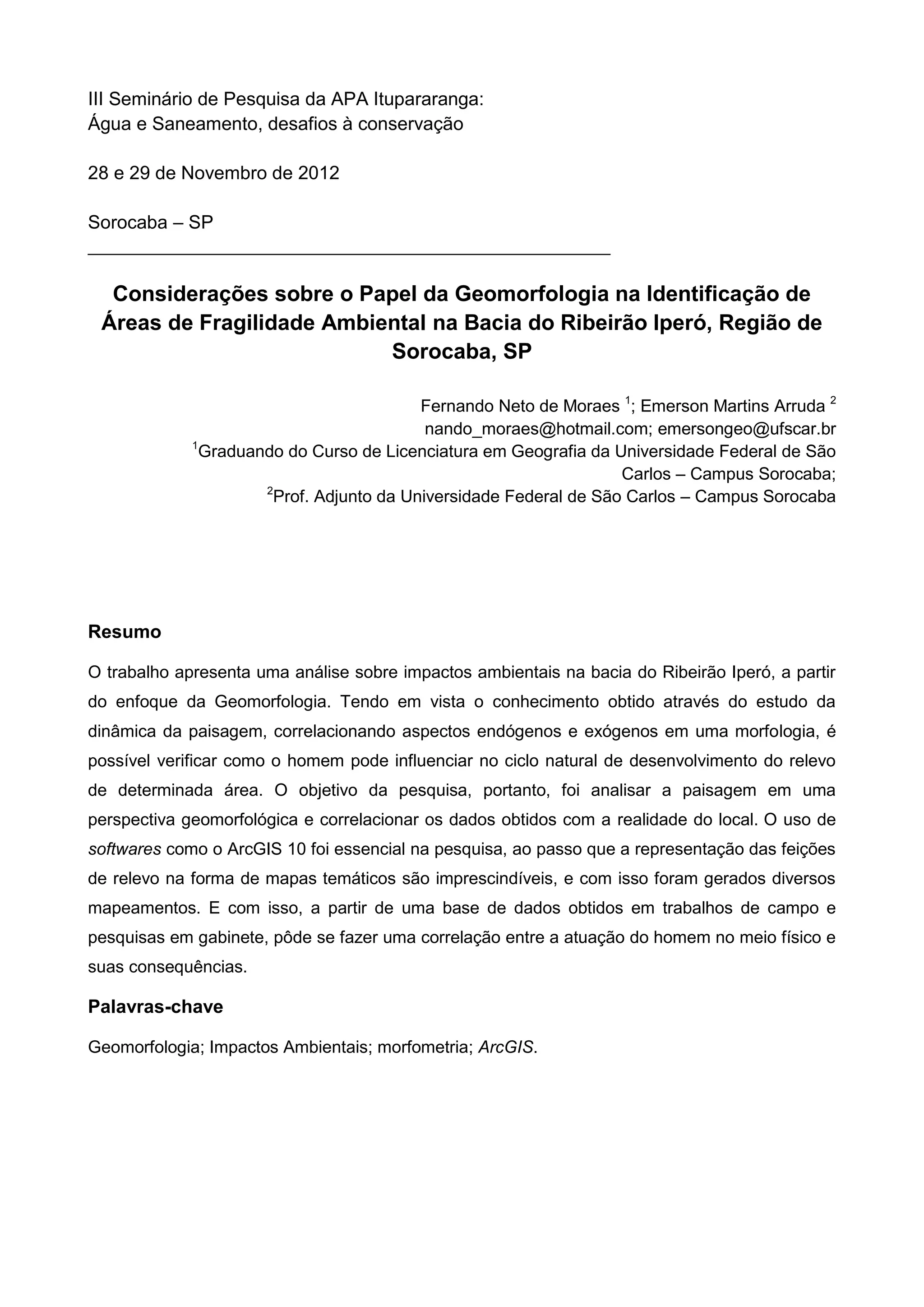1. O documento apresenta uma análise dos impactos ambientais na bacia do Ribeirão Iperó a partir da perspectiva da geomorfologia, correlacionando aspectos naturais e humanos.