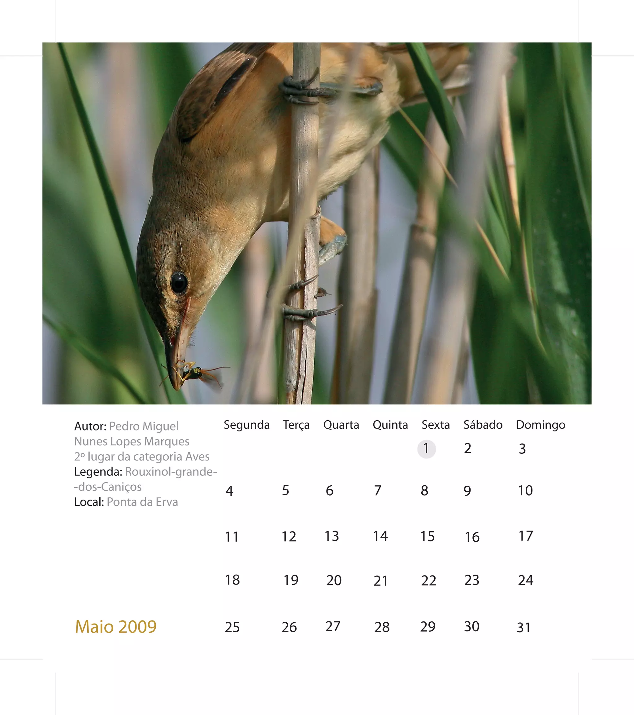 O documento é um registro de observação de aves feito por Pedro Miguel Nunes Lopes Marques em maio de 2009 na Ponta da Erva, onde ele observou o Rouxinol-grande-dos-Caniços, que ficou em 2o lugar na categoria Aves, em dias específicos do mês.