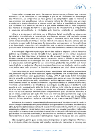 O documento discute as antigas e novas atribuições dos profissionais da informação. Apresenta como antigas atribuições a preservação, organização e disseminação da informação. Entre as novas atribuições estão a disseminação online, a indexação usando linguagem natural e o uso da web semântica. Conclui que as atribuições devem ser desempenhadas com responsabilidade ética e social.