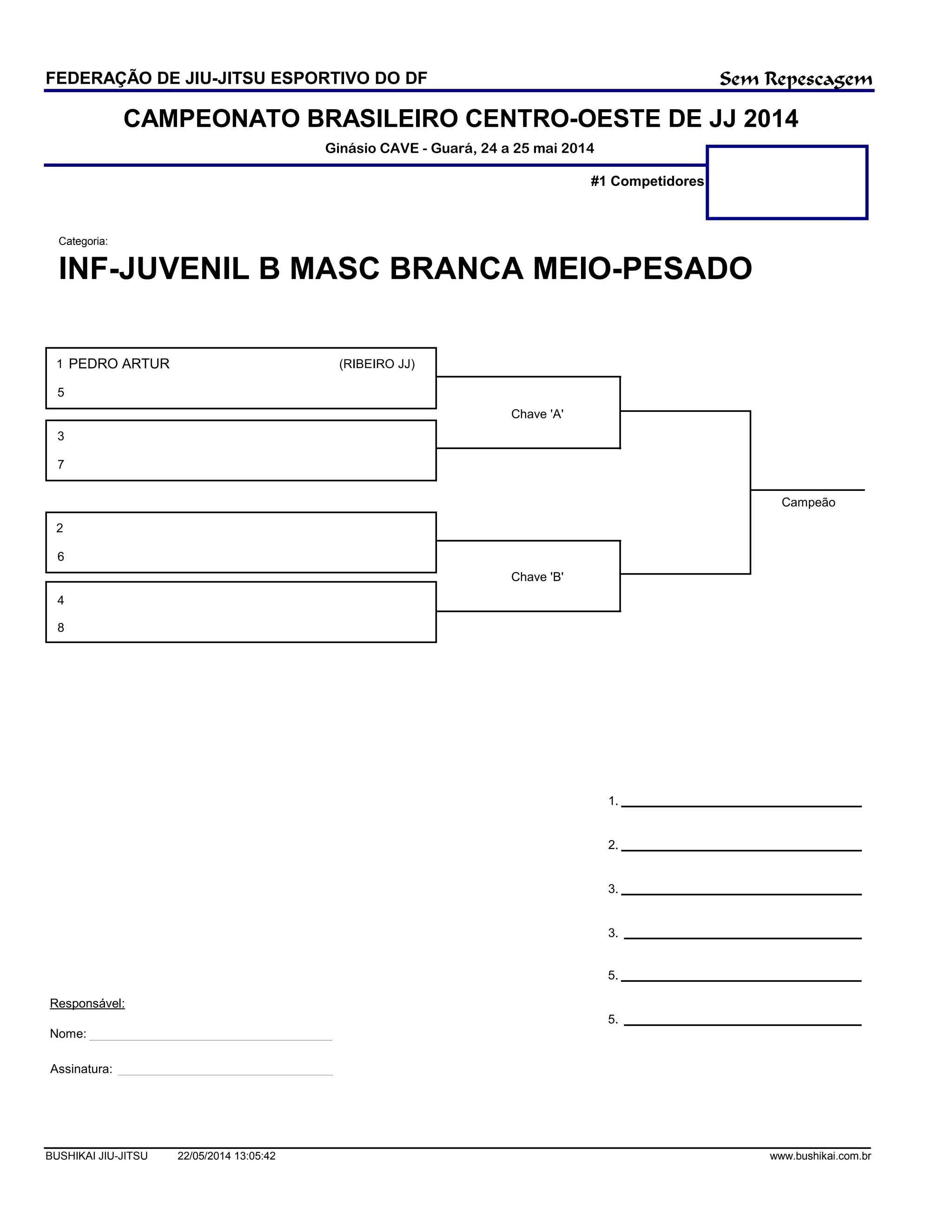O documento apresenta os resultados da categoria Infanto-Juvenil B Masculino Branca Meio-Pesado do Campeonato Brasileiro Centro-Oeste de Jiu-Jitsu 2014 realizado nos dias 24 e 25 de maio no Ginásio CAVE em Guará. Pedro Artur da equipe Ribeirão JJ foi o campeão ao derrotar os cinco oponentes em sua chave e os dois da chave B na final.