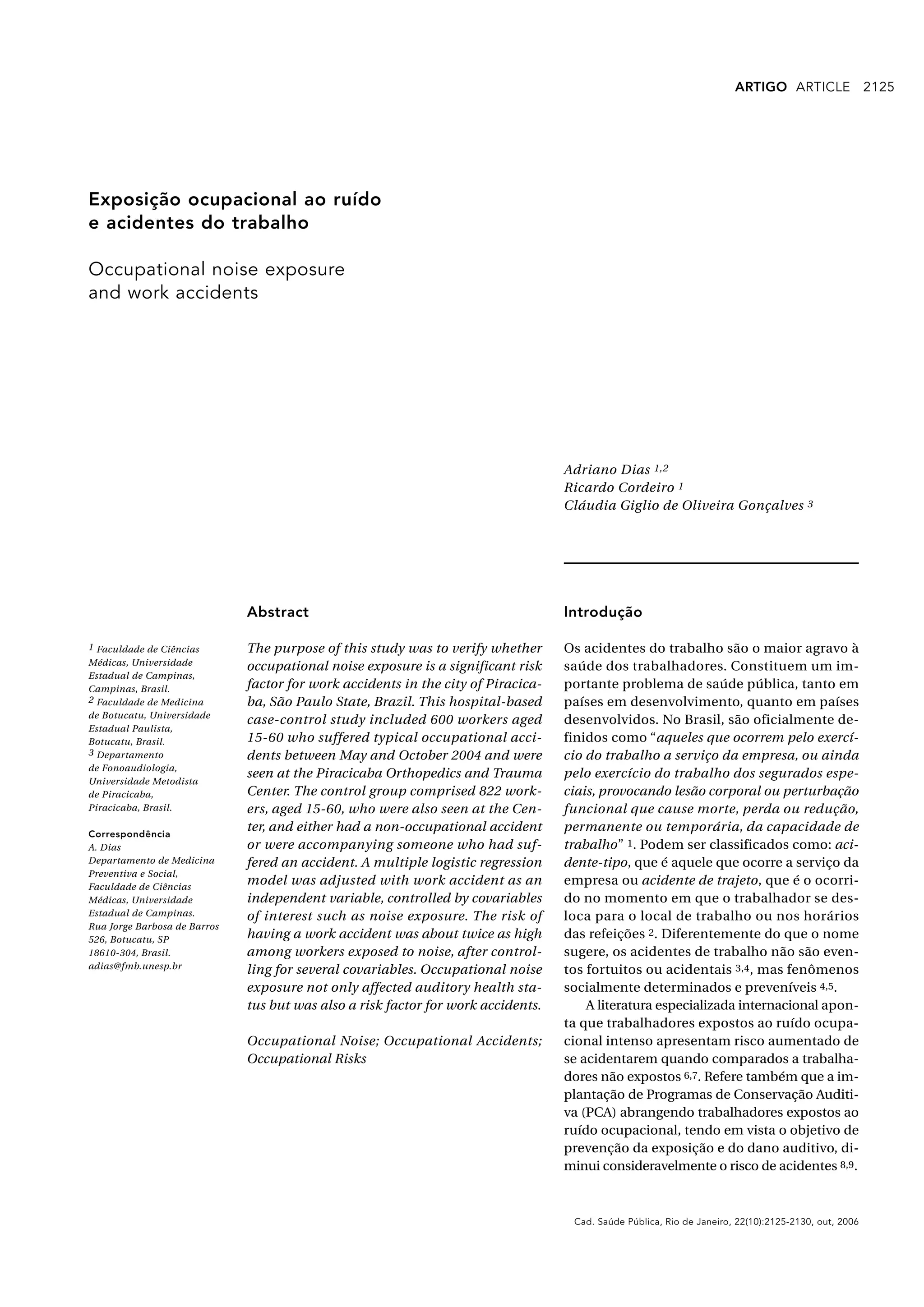 Este estudo investigou a relação entre exposição ocupacional ao ruído e acidentes de trabalho em uma cidade brasileira. Os resultados mostraram que trabalhadores expostos a níveis médios ou altos de ruído no trabalho tinham um risco 1,4 a 1,9 vezes maior de sofrer acidentes, após controlar outros fatores. O estudo conclui que a exposição ao ruído no trabalho constitui um fator de risco significativo para acidentes, afetando não apenas a saúde auditiva mas também a segurança no trabalho.