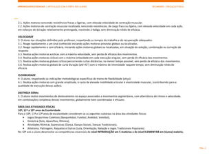 O documento descreve as aprendizagens essenciais para os alunos do ensino secundário na área da Educação Física. Detalha as competências relacionadas com a aptidão física como resistência, força, velocidade e flexibilidade. Também descreve as subáreas de atividades físicas como jogos desportivos coletivos, ginástica e atletismo. Fornece exemplos de aprendizagens para três níveis - introdução, elementar e avançado - em atividades como futebol, voleibol