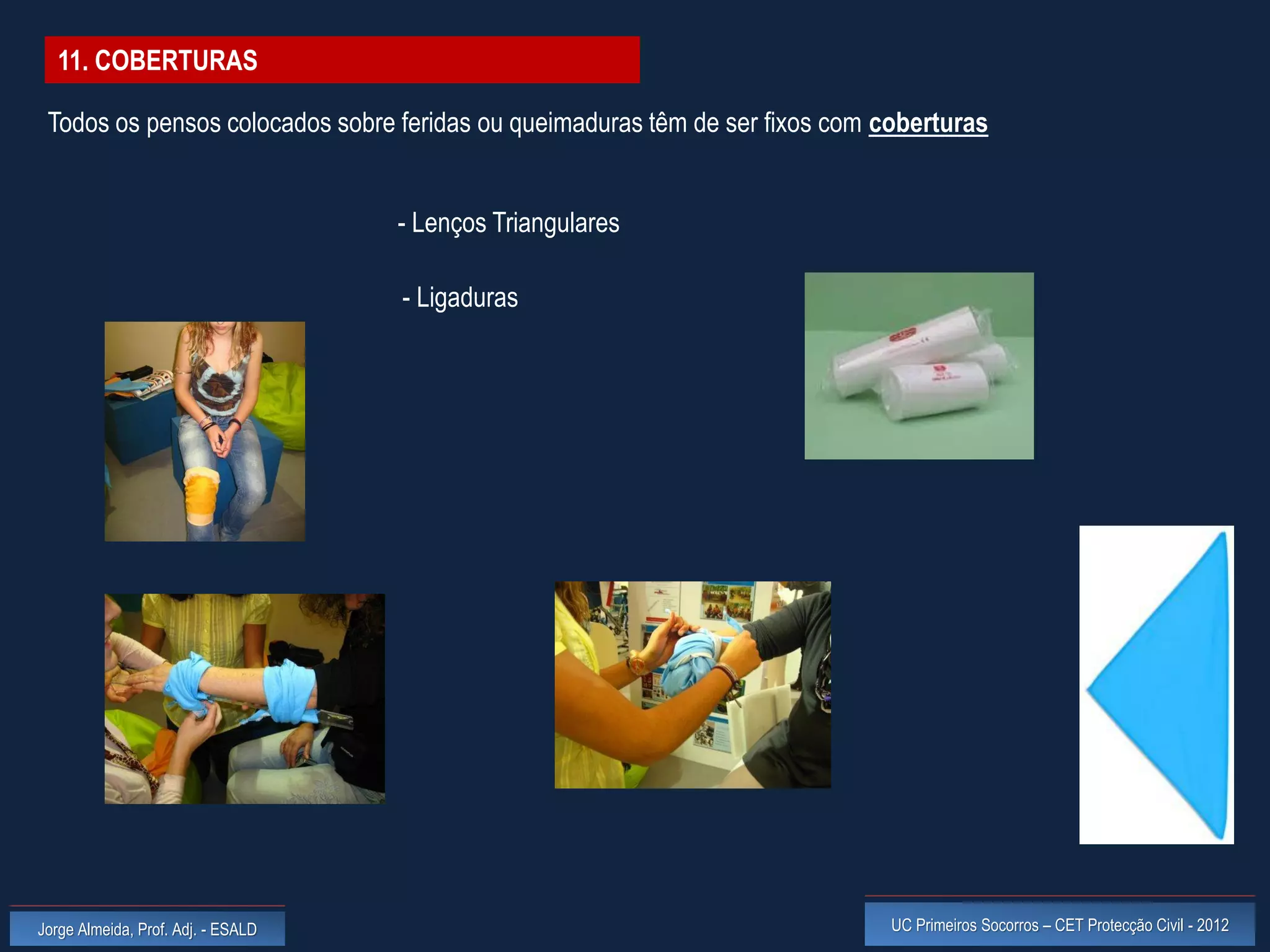 O documento discute as coberturas adequadas para diferentes partes do corpo, incluindo como fixar pensos em feridas usando lenços triangulares ou ligaduras, aplicadas de forma a não causar mais danos e permitir movimento caso necessário até receber cuidados médicos.