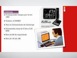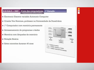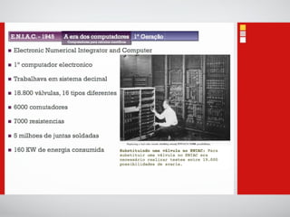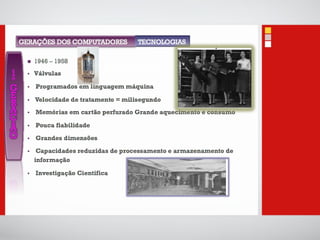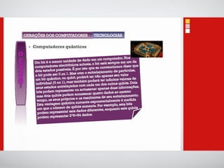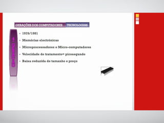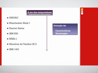 O documento introduz conceitos básicos sobre tecnologias de informação e comunicação, incluindo: 1) A definição de dados, informação e computadores; 2) As principais partes de um sistema de computador, incluindo processador, memória, entrada e saída; 3) Diferentes categorias de sistemas de computadores de acordo com o número de usuários e tarefas.