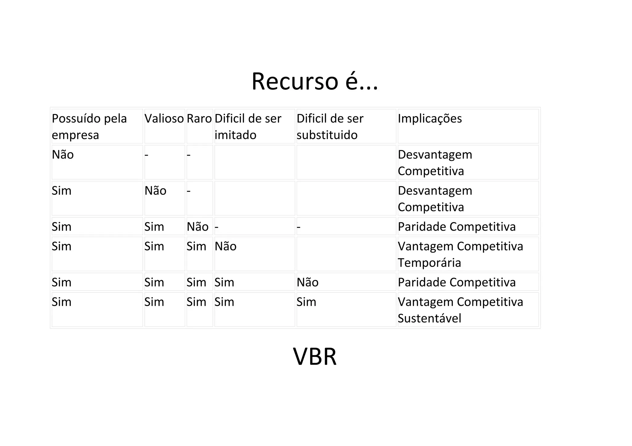 A tabela classifica os recursos de uma empresa em seis categorias com base em quatro critérios: se o recurso é valioso, raro, difícil de ser imitado e substituído. Os recursos que são valiosos, raros, difíceis de imitar e substituir conferem à empresa uma vantagem competitiva sustentável.