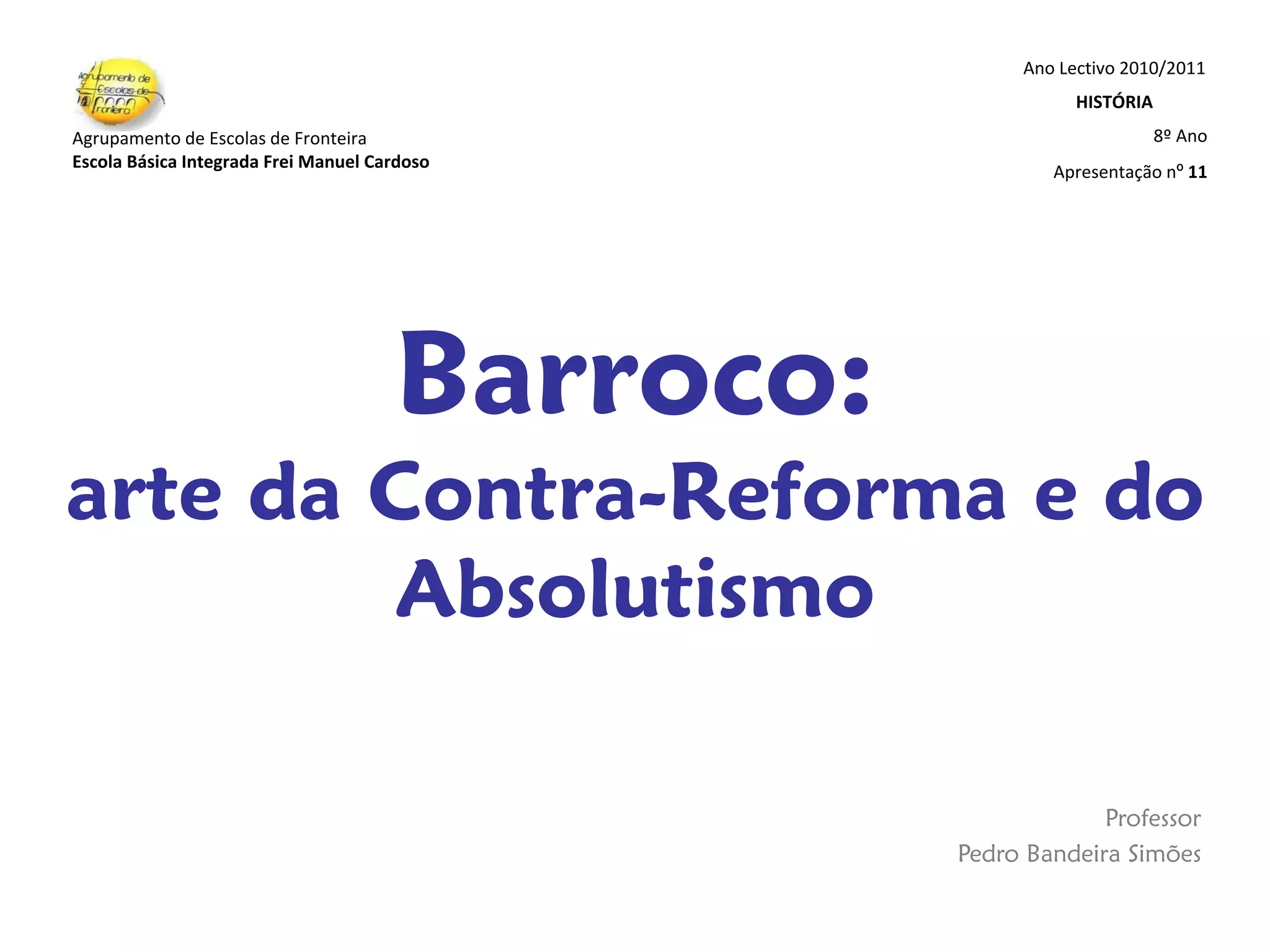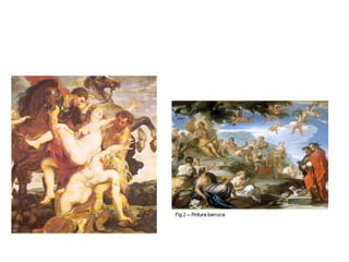 O documento resume as principais características da arte barroca, que surgiu no final do século XVI em Roma e se expandiu pela Europa. O estilo barroco se caracteriza pelo movimento, dramatismo e exagero, em contraste com a simplicidade renascentista. Foi uma arte associada à Contra-Reforma e ao absolutismo real, buscando impressionar os fiéis de forma espectacular. Manifestou-se na arquitetura, escultura, pintura e outras artes.