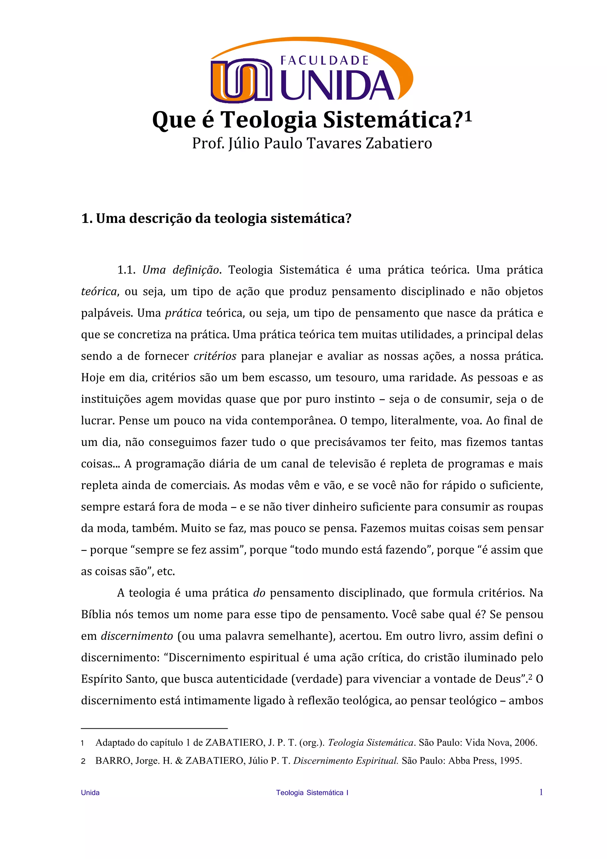 - A teologia sistemática é uma prática teórica que fornece critérios para planejar e avaliar nossas ações através do discernimento. Ela está a serviço da espiritualidade cristã e da missão de Deus.