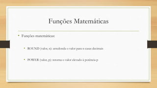 O documento descreve funções de string e matemática no MySQL Workbench, incluindo funções como ROUND e POWER para arredondar e elevar valores a potências, e funções de caracteres como SUBSTRING e LOWER para extrair partes de strings e converter para minúsculo. Exemplos demonstram o uso dessas funções para selecionar dados arredondados, elevados a potências, e partes de strings em minúsculo de tabelas.