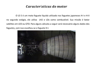 O documento descreve as características do motor LE-5, um foguete de combustível líquido usado nos foguetes japoneses H-I e H-II. Ele fornece detalhes técnicos sobre o motor, incluindo dados fixos, pressões, temperaturas, velocidades e dimensões características.