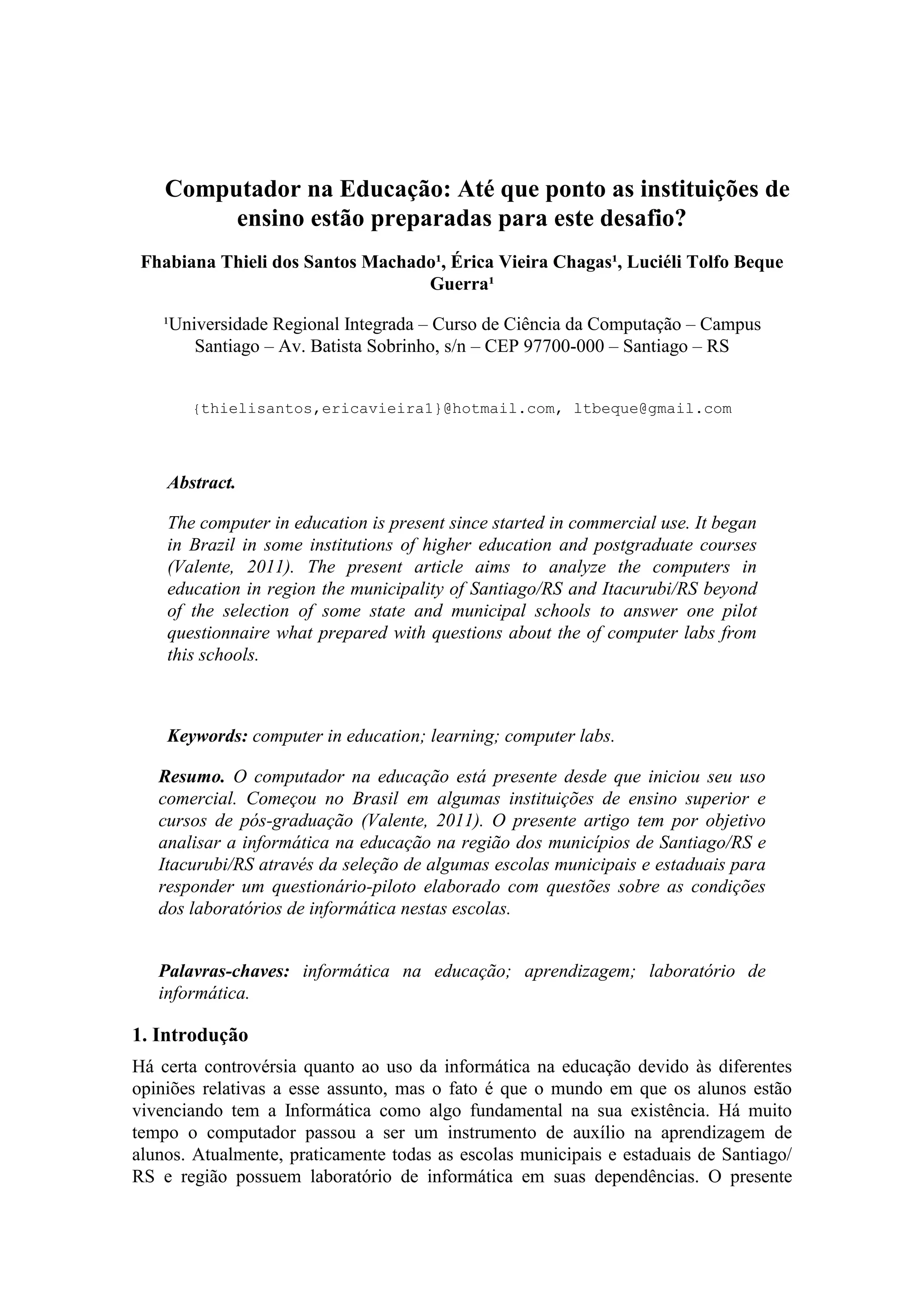 O documento analisa o uso de computadores na educação em escolas de Santiago e Itacurubi no Rio Grande do Sul. As escolas têm laboratórios de informática, mas os computadores são usados principalmente para pesquisas e em períodos vagos, em vez de serem integrados ao processo de ensino-aprendizagem. Há necessidade de melhor capacitação de professores e uso da tecnologia no currículo escolar.
