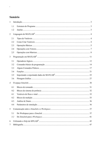 Este documento introduz o MATLAB® e suas aplicações em engenharia elétrica. Ele descreve as janelas e tipos de variáveis do MATLAB®, além de operações básicas com vetores e matrizes. Também apresenta comandos de programação, importação e exportação de dados, plotagem gráfica e a ferramenta Simulink para simulação de sistemas.