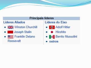 A Segunda Guerra Mundial foi um conflito global de 1939 a 1945 entre as potências do Eixo (Alemanha, Itália e Japão) e os Aliados (principalmente Reino Unido, EUA e URSS). Foi a guerra mais mortal da história com mais de 70 milhões de mortes. Levou ao desenvolvimento de novas tecnologias e ao estabelecimento da Organização das Nações Unidas para manter a paz mundial.