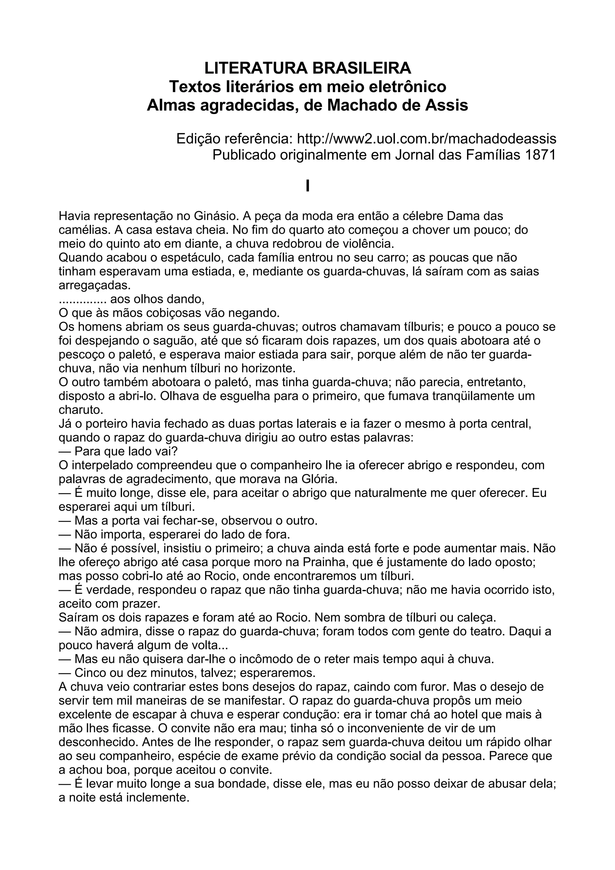 Este resumo descreve o documento "Almas agradecidas" de Machado de Assis. Em 3 frases: