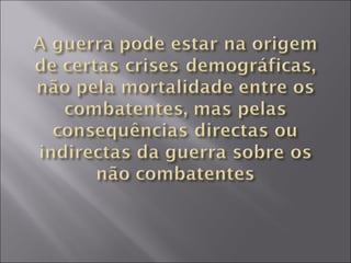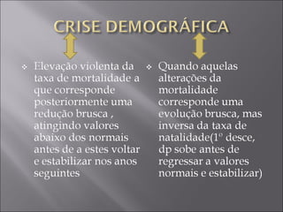 O documento descreve a população da Europa nos séculos XVII e XVIII, caracterizada por crises e crescimento. A população vivia em condições precárias devido à baixa produtividade agrícola e ao clima frio, levando a fomes frequentes. Nos anos ruins, a fome e as doenças causavam grandes quebras populacionais, até que as condições melhorassem e a população voltasse a crescer, num ciclo repetitivo. No século XVIII, novos desenvolvimentos levaram a uma redução da mortalidade