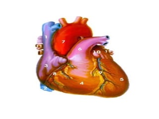 O documento descreve a anatomia e fisiologia do coração humano. O coração é um órgão muscular localizado no tórax que bombeia sangue através de dois sistemas de circulação independentes. Ele é composto de quatro camadas e possui duas aurículas e dois ventrículos, cada um com válvulas que regulam o fluxo sanguíneo. O coração bombeia continuamente sangue rico em oxigênio para o corpo e sangue pobre em oxigênio para os pulmões através de artérias e veias.