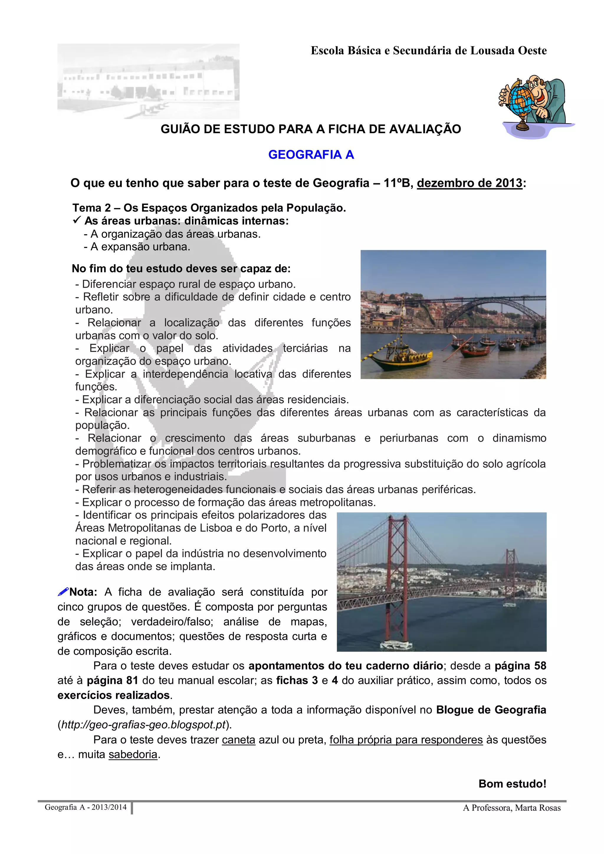 Este documento fornece um guia de estudo para um teste de Geografia sobre espaços organizados pela população, incluindo áreas urbanas. O guia lista os tópicos a serem estudados como a organização e expansão urbana, e as habilidades que os alunos devem desenvolver como diferenciar espaços rurais e urbanos e explicar o papel das atividades terciárias. O teste será constituído por vários tipos de questões e os alunos devem estudar seus materiais de aula e exercícios para se preparar.