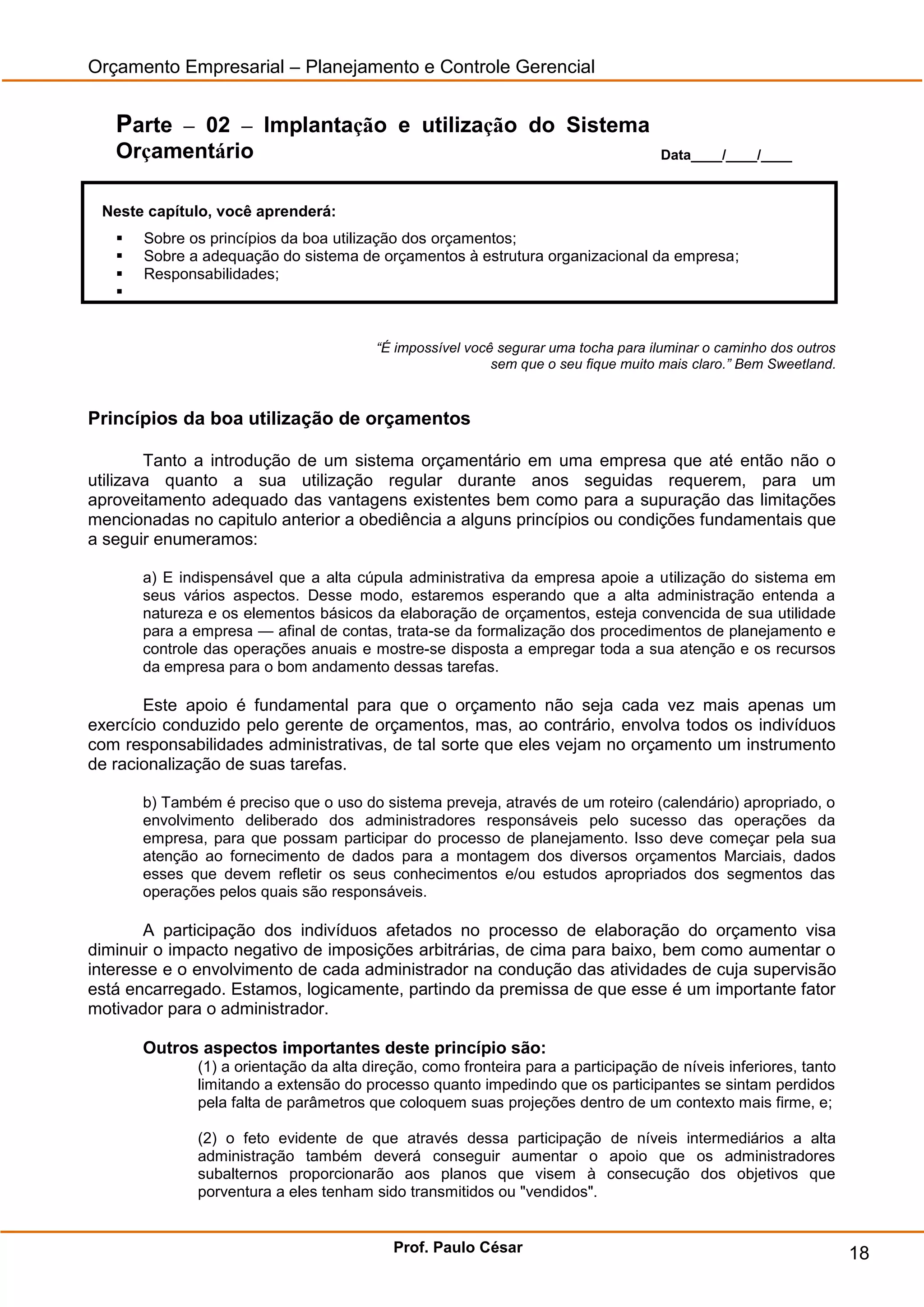 O documento discute princípios para a boa utilização de orçamentos em empresas, incluindo: (1) apoio da alta administração é fundamental; (2) envolvimento dos administradores responsáveis no processo de planejamento é importante; (3) o sistema deve gerar informações focadas apenas em diferenças significativas entre o planejado e o realizado.