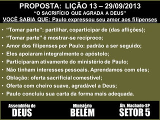 PROPOSTA DA LIÇÃO IgrejaEvangélica Assembleia de Deus Ministério Belém – Setor 5 – Álvares Machado Campo de Presidente Prudente - SP • Os filipenses surpreenderam Paulo com outra oferta; • Filipos: primeira cidade européia a ouvir o Evangelho; • A igreja precisa prover sustento para os que a servem; • Deus cuida dos seus – Paulo estava convicto disto; • Ele aceitou as privações sem se envergonhar; • Muitos deixam suas famílias para pregarem o Evangelho; • A piedade com contentamento, já é um grande ganho; • A fé em Jesus fez de Paulo um grande vencedor; • Paulo não perdeu sua visão missionária.