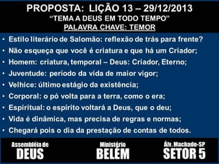 1) O documento discute lições bíblicas sobre viver a vida com propósito, dinamismo, fé, esperança e responsabilidade de acordo com a passagem bíblica de Eclesiastes 11.