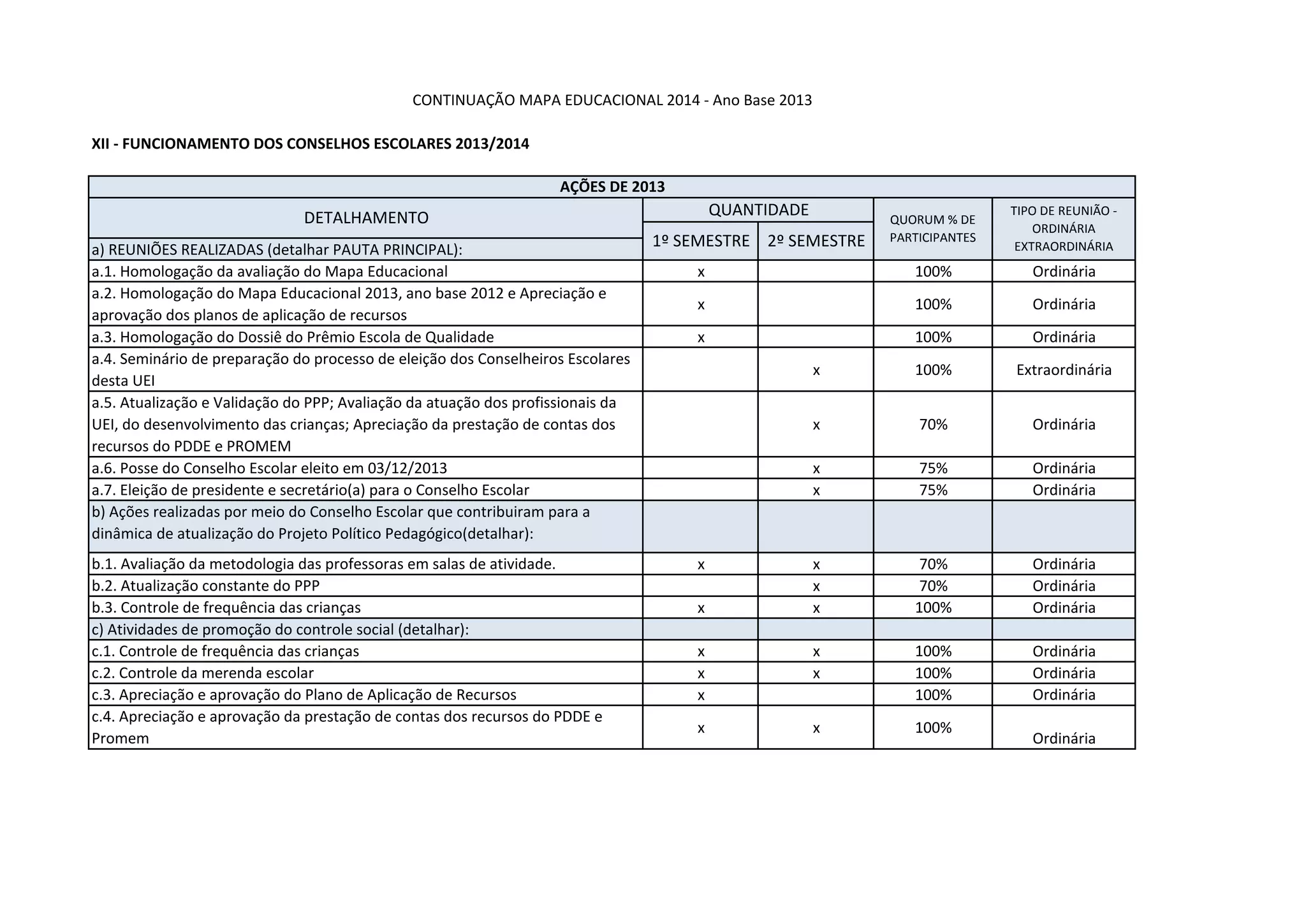 O documento descreve as reuniões realizadas e projetadas para o Conselho Escolar em 2013-2014. Em 2013, as reuniões trataram principalmente de homologações, avaliações e atualizações. Em 2014, as reuniões projetadas também incluirão essas atividades, além de controle social e fiscalização de recursos.