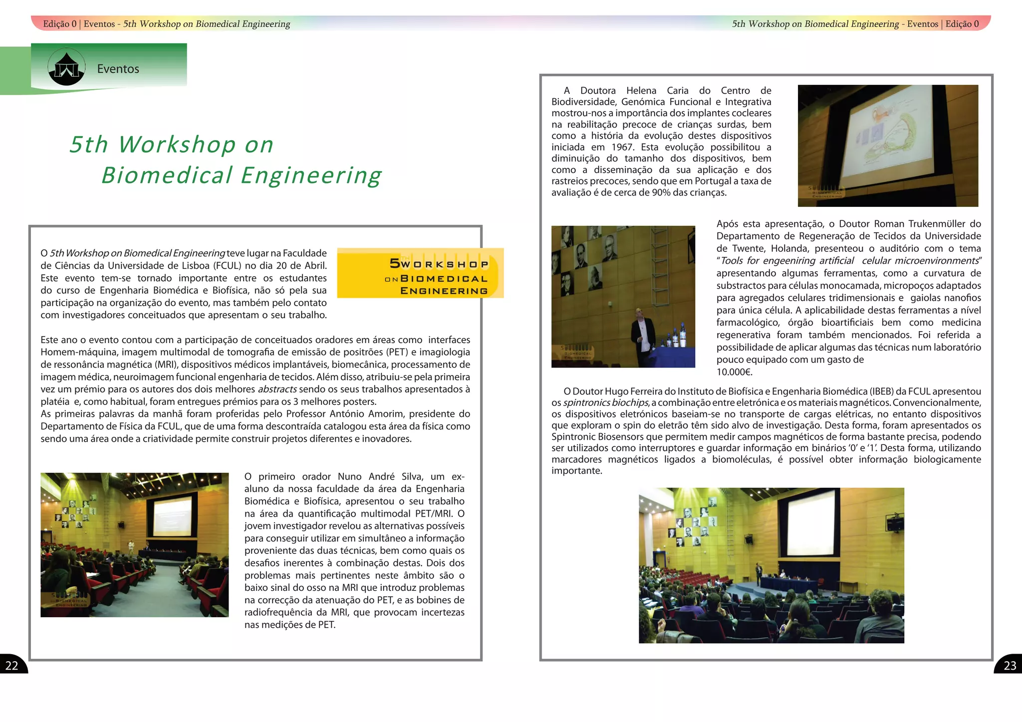 O 5º workshop de engenharia biomédica na Faculdade de Ciências da Universidade de Lisboa apresentou oradores renomados e premiações para os melhores abstracts e pôsteres. O evento destacou temas como interfaces homem-máquina, neuroimagem e dispositivos médicos, com foco em inovações e evolução em tecnologia médica. Pesquisadores apresentaram trabalhos sobre diversas técnicas, incluindo a quantificação de imagens multimodais e a reabilitação com implantes cocleares.