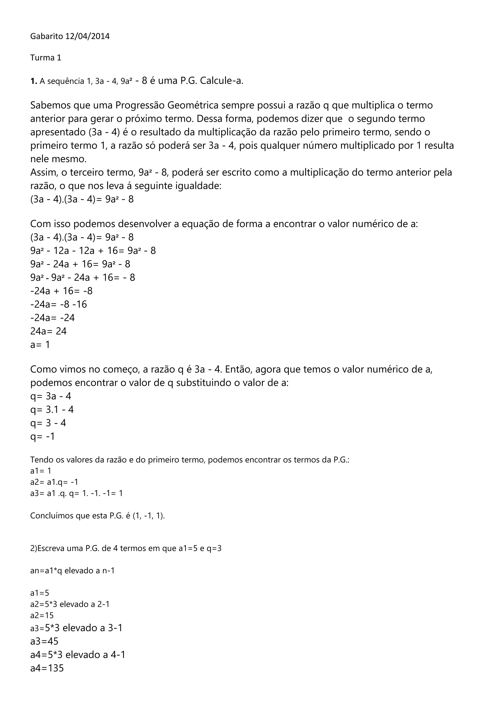 1.A sequência 1, 3a - 4, 9a² - 8 é uma P.G. Calcule-a.