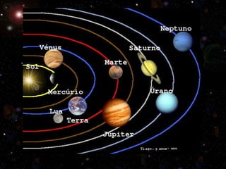 O documento descreve os corpos celestes que compõem o sistema solar, incluindo o Sol, planetas e luas. Explica que os astros podem ser estrelas, que emitem sua própria luz, ou planetas, que refletem a luz do Sol. Detalha cada planeta do sistema solar, suas características físicas e órbitas em torno do Sol.