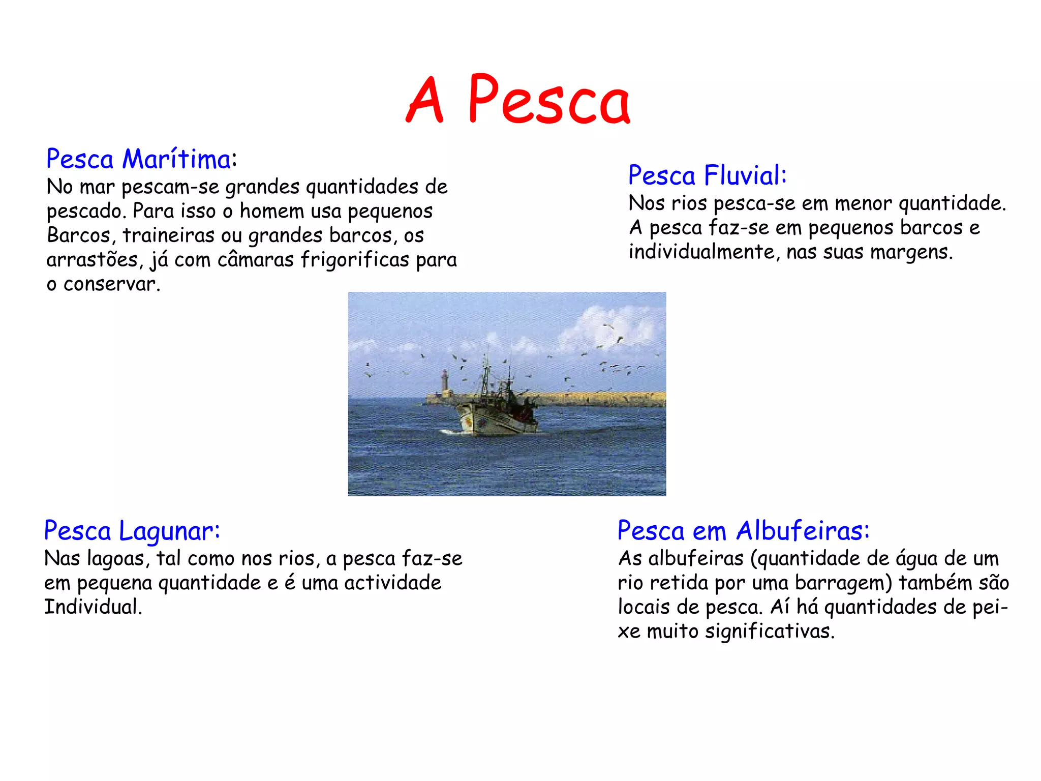 O documento descreve os diferentes tipos de pesca (marítima, fluvial, lagunar e em albufeiras) e as principais espécies pescadas de água doce e salgada. Também aborda os usos da pesca como fonte de alimentos e matérias-primas através de processos como congelamento, fumagem e enlatamento. Por fim, descreve outras atividades ligadas aos meios aquáticos como a extração de sal e a apanha de algas.