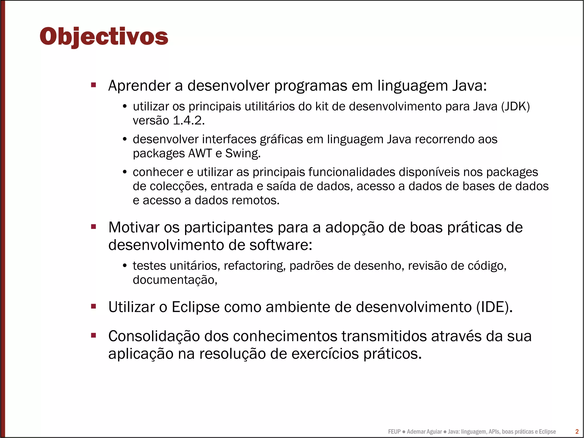 O documento descreve um curso sobre programação em Java que inclui os seguintes tópicos: introdução à linguagem Java, APIs, boas práticas de programação e o uso do Eclipse. O curso é dividido em quatro partes abordando introdução ao Java, coleções e entrada/saída de dados, interfaces gráficas com Swing e acesso a dados remotos.