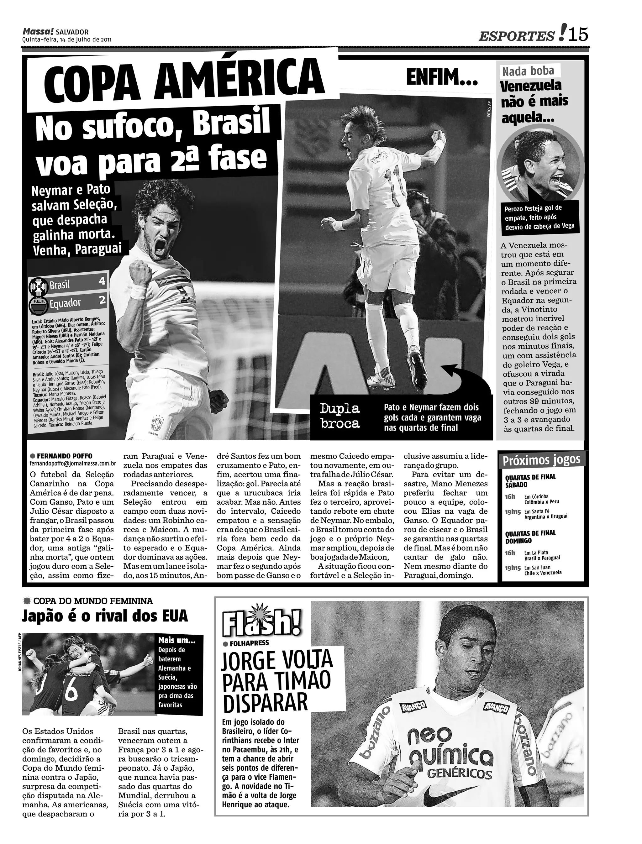 O Brasil venceu o Equador por 4 a 2 na Copa América com gols de Pato e Neymar. A seleção precisava da vitória para se classificar às quartas de final, onde enfrentará o Paraguai no domingo. O Japão surpreendeu e derrotou a Suécia para enfrentar os Estados Unidos na final da Copa do Mundo Feminina.
