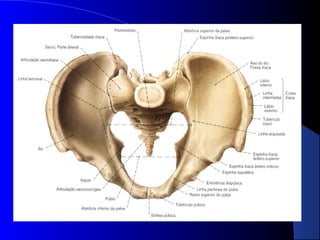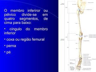 O documento descreve os principais ossos e segmentos do membro inferior humano, incluindo o quadril, fêmur, patela, tíbia, fíbula, tarso, metatarso e falanges. O membro inferior é dividido em quatro segmentos principais - cíngulo do membro inferior, coxa, perna e pé - e cada segmento contém vários ossos que articulam uns com os outros para permitir a locomoção e sustentação do corpo.