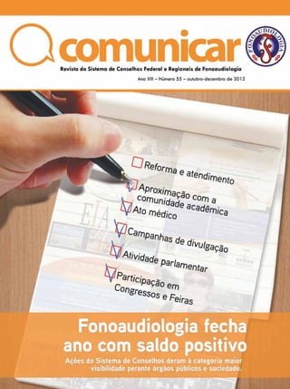 O documento resume as principais ações realizadas pelo Conselho Federal de Fonoaudiologia (CFFa) ao longo de 2012, incluindo campanhas de divulgação da profissão, participação em eventos, reforma da sede do CFFa e acompanhamento de projetos de lei no Congresso Nacional.