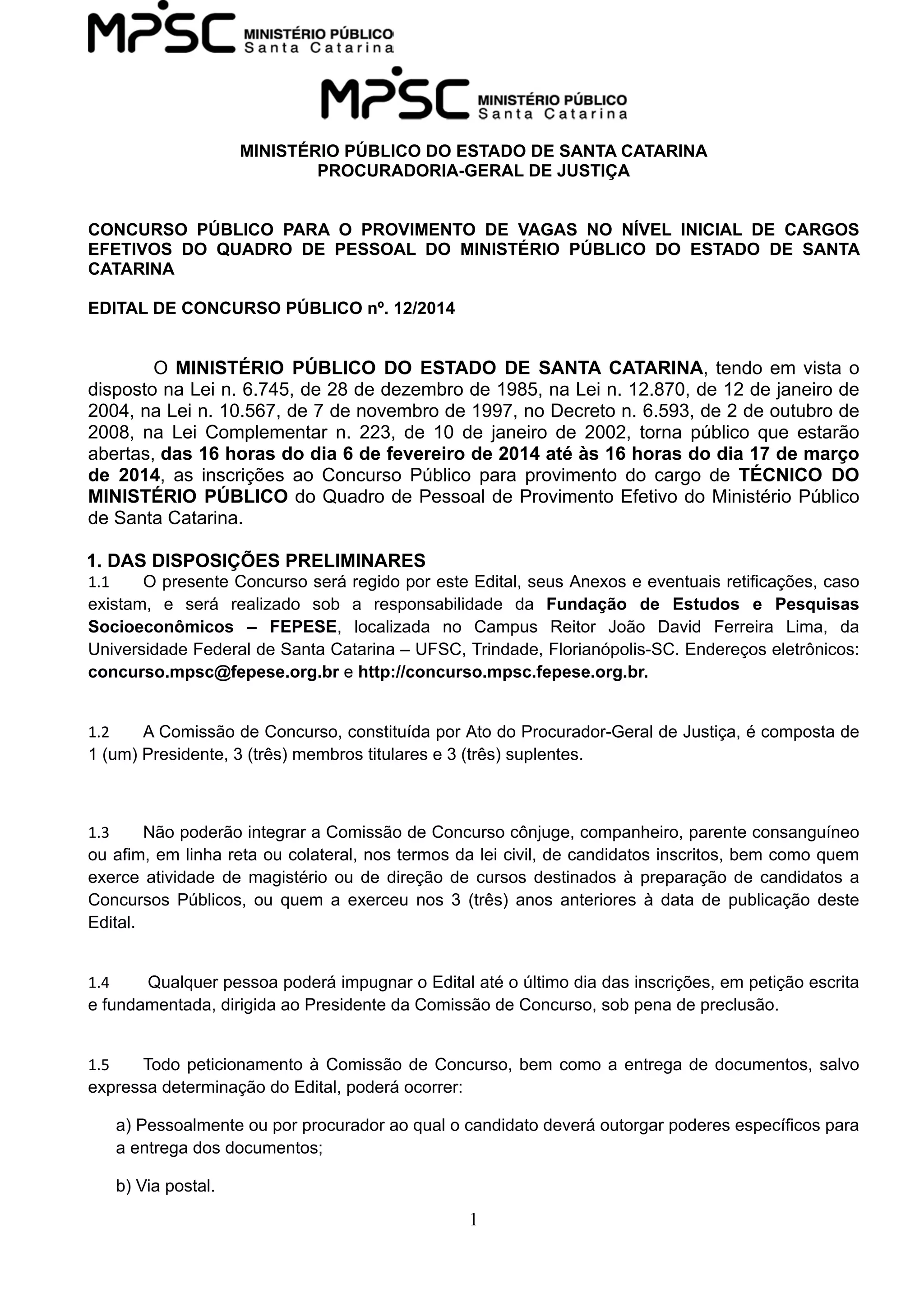 Este documento anuncia um concurso público para o cargo de Técnico do Ministério Público no estado de Santa Catarina, com 3 vagas. O concurso será realizado pela FEPESE e terá provas objetivas e discursivas. Os requisitos para participar incluem ter ensino médio completo e estar em dia com as obrigações eleitorais e militares.