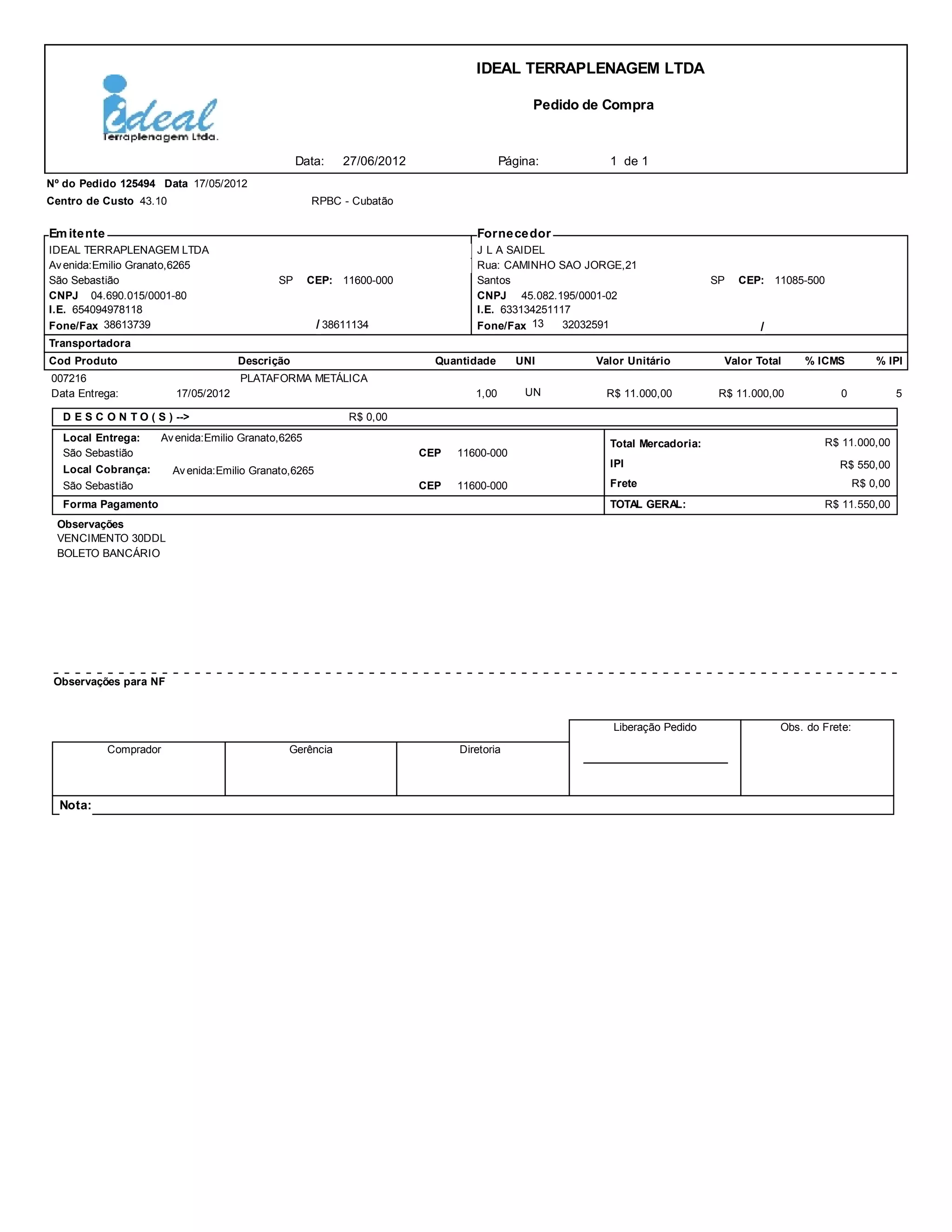 O documento é um pedido de compra da empresa IDEAL TERRAPLENAGEM LTDA para a aquisição de uma plataforma metálica da empresa J L A SAIDEL no valor de R$11.000,00, com entrega prevista para 17/05/2012. O pagamento será feito através de boleto bancário com vencimento em 30 dias.