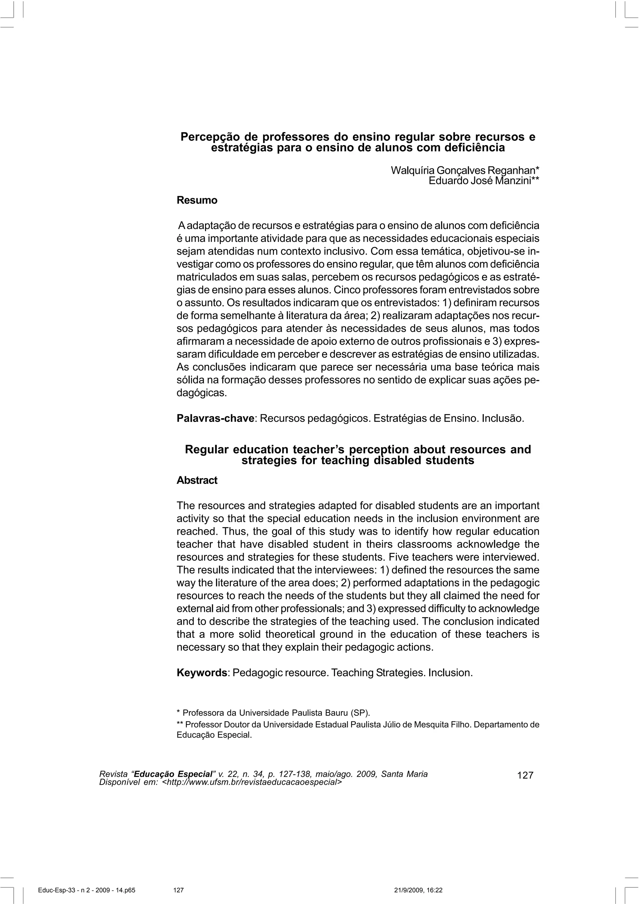1) O documento discute a percepção de professores do ensino regular sobre recursos e estratégias para ensinar alunos com deficiência.