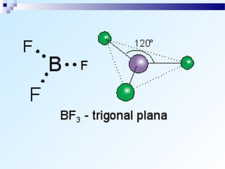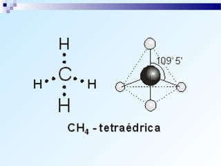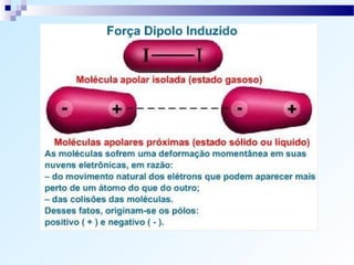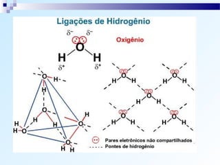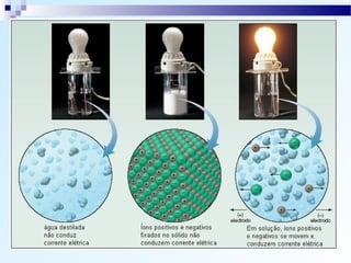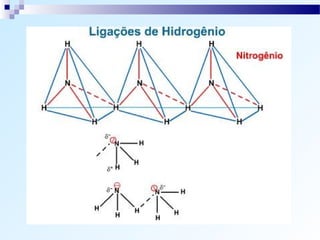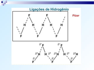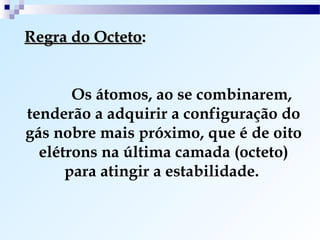 O documento discute os tipos de ligação química, incluindo ligação iônica, covalente e metálica. Explica como os átomos tendem a adquirir a configuração eletrônica de gás nobre através da transferência ou compartilhamento de elétrons. Também descreve como determinar o caráter de uma ligação baseado na diferença de eletronegatividade.