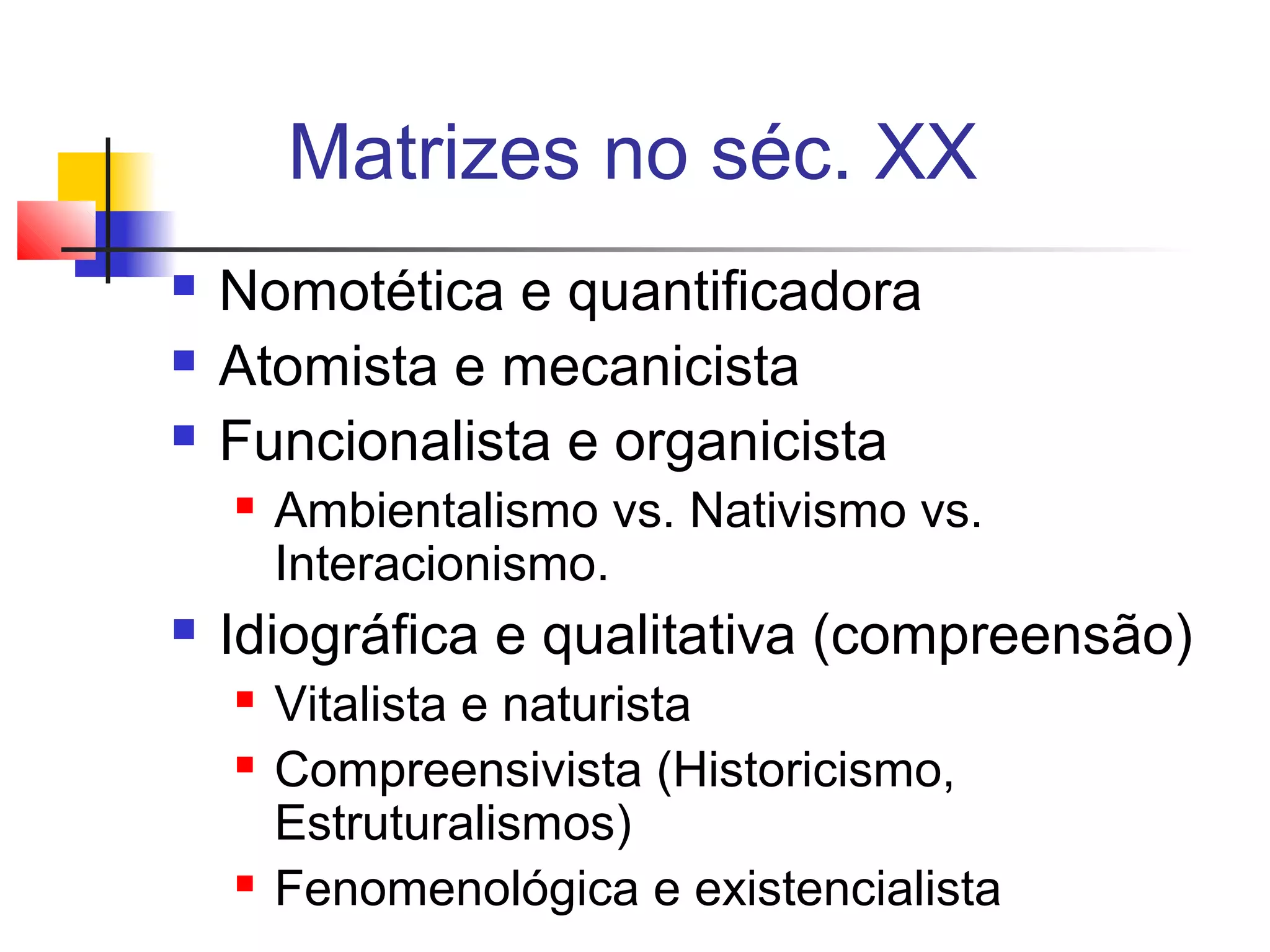 O documento discute as principais matrizes científicas que influenciaram a psicologia no século XX, incluindo:
