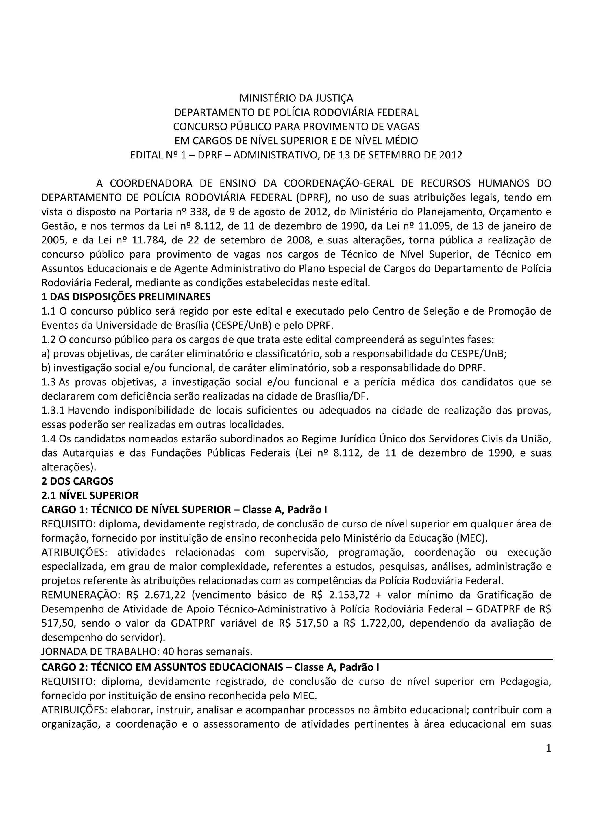Este edital anuncia a realização de um concurso público para preenchimento de vagas no Departamento de Polícia Rodoviária Federal. Serão ofertadas vagas nos níveis superior e médio, incluindo técnico de nível superior, técnico em assuntos educacionais e agente administrativo. O edital define os requisitos, atribuições e remuneração de cada cargo, além das normas sobre inscrição, provas, investigação social e perícia médica.