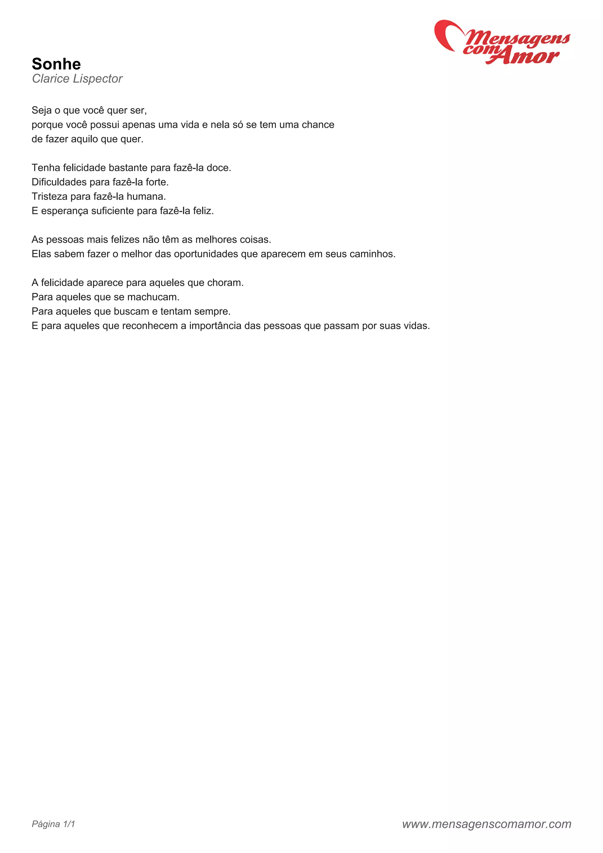 O texto encoraja as pessoas a serem o que quiserem ser e aproveitarem a única vida que têm para realizar seus sonhos. Também sugere que a felicidade vem de saber aproveitar as oportunidades, de lidar com tristezas e dificuldades, e de valorizar as pessoas ao nosso redor.