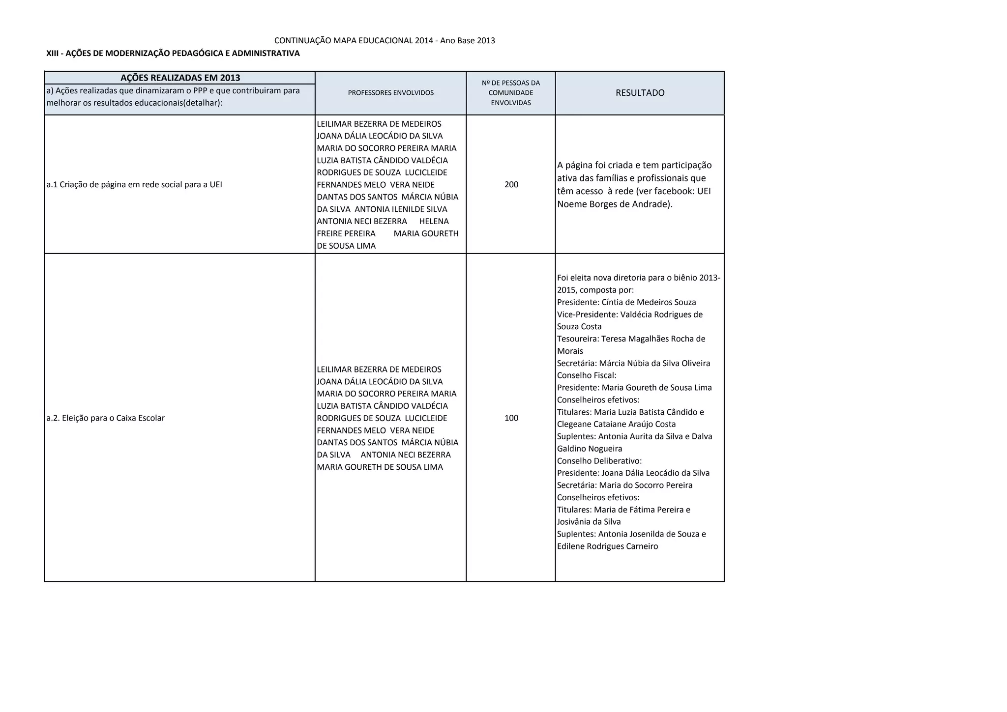 O documento descreve as ações realizadas em 2013 e projetadas para 2014 na UEI Noeme Borges de Andrade, com o objetivo de dinamizar o Projeto Político Pedagógico, melhorar os resultados educacionais, e dinamizar a gestão administrativa e financeira. Em 2013, destacam-se a criação de uma página na rede social para a UEI, eleições para o Caixa Escolar e Conselho Escolar, reconhecimento aos servidores, e avaliação do desempenho dos professores. Para 2014, projetam-se monitoramento bimestral