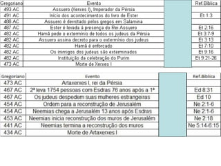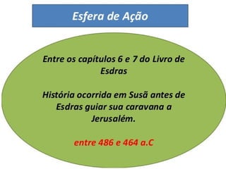 (1) O livro conta como a rainha Ester salvou o povo judeu de um decreto de extermínio emitido pelo primeiro-ministro Hamã no Império Persa.