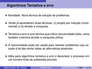 A técnica de projeto de algoritmos tentativa e erro foi apresentada, na qual todas as alternativas possíveis são tentadas para resolver problemas. Um exemplo de algoritmo tentativa e erro para o passeio do cavalo no xadrez foi demonstrado, no qual todas as movimentações possíveis são tentadas recursivamente até encontrar uma solução ou não.