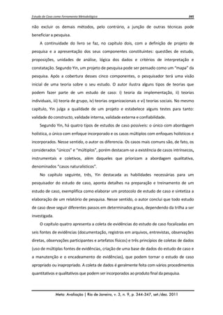 O documento resume o livro "Estudo de caso: planejamento e métodos" de Robert Yin, que apresenta a metodologia de estudo de caso e suas etapas. O autor discute os tipos de estudo de caso, a importância da coleta e análise de dados, e como elaborar relatórios para diferentes públicos-alvo. O documento conclui destacando a importância dos estudos de caso nos estudos acadêmicos.