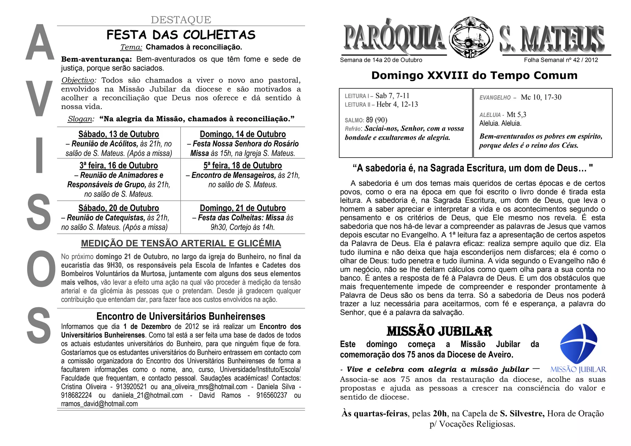 1) O documento anuncia a Festa das Colheitas na paróquia, com uma missa no domingo às 9h30 e um cortejo às 14h.