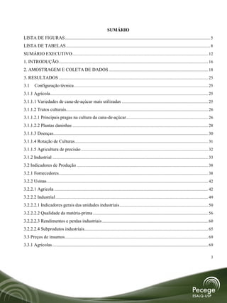 Este relatório apresenta os resultados da pesquisa sobre custos de produção de cana-de-açúcar, açúcar e etanol no Brasil referente à safra 2010/2011. Inclui detalhes sobre a configuração técnica e indicadores de produção de fornecedores e usinas, preços de insumos e custos de produção. Analisa a evolução dos resultados dos levantamentos de custo anteriores.